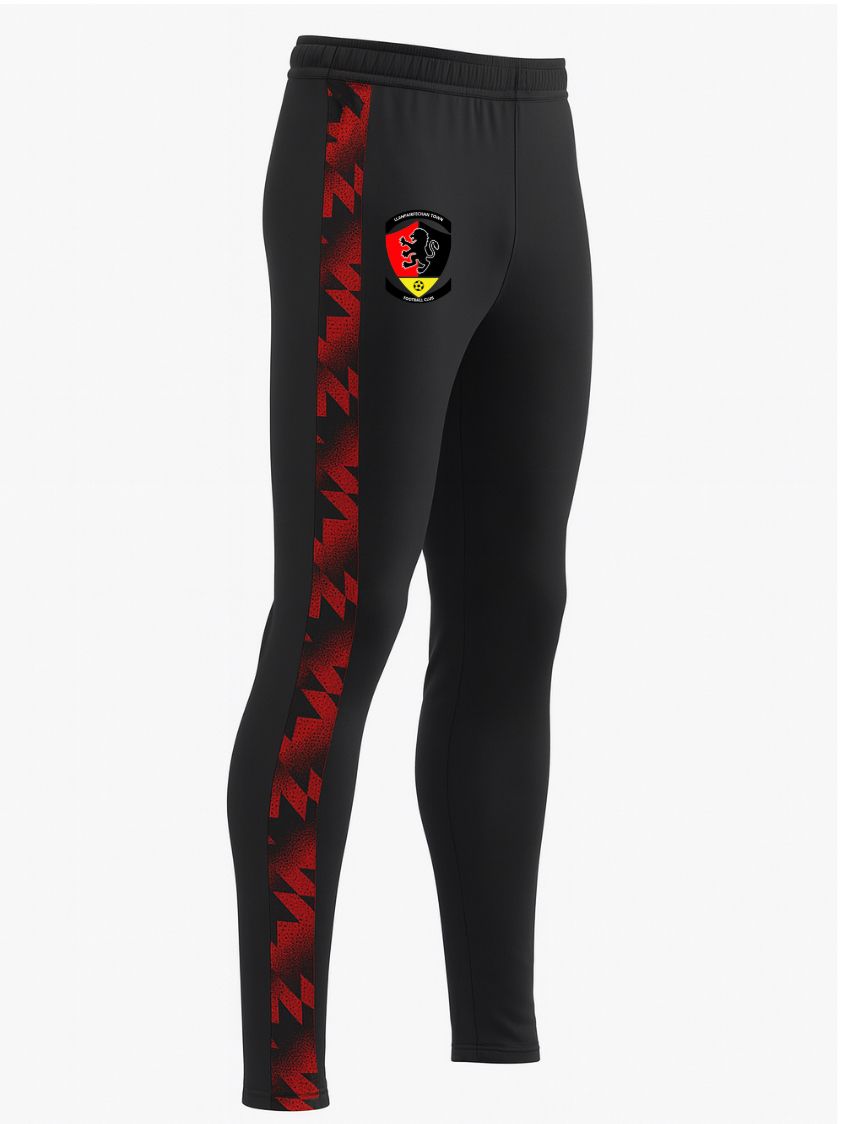 Official Llanfairfechan Town FC warm up trousers with a red zigzag side panel and tapered fit. Comfortable, flexible, and perfect for training, warm ups, or everyday wear.